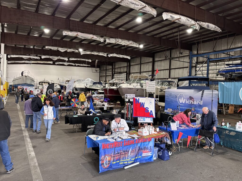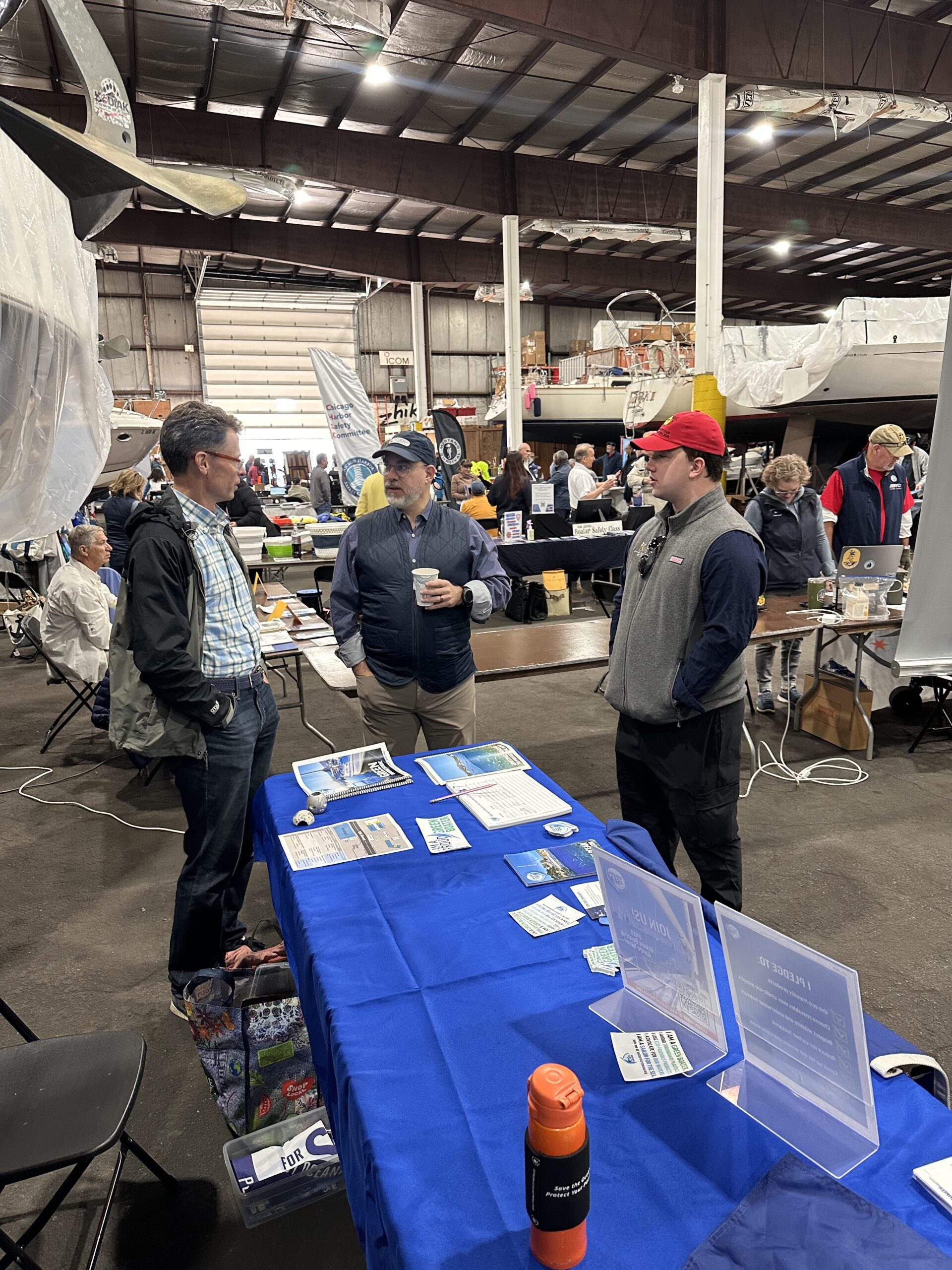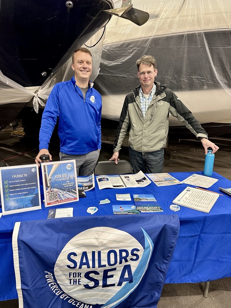 Chicago region Skipper volunteers Ben Stern (Chicago Corinthian Yacht Club) and Jeff Boyle (Columbia Yacht Club) spoke with dozens of local boaters at the event. Tucked into one of the cavernous storage sheds at Crowley’s Yacht Yard, Ben and Jeff fielded questions about Sailors for the Sea while sharing the latest Green Boating Guide (electronic copies, of course!).